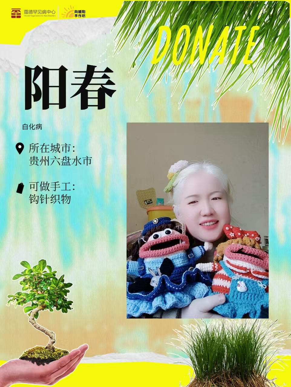 我叫阳春,大家也可以叫我肉包子,我是一名白化症患者,是向暖阳手作坊发起人之一,同时也是向暖阳手作坊金牌老师及宣传代言人。